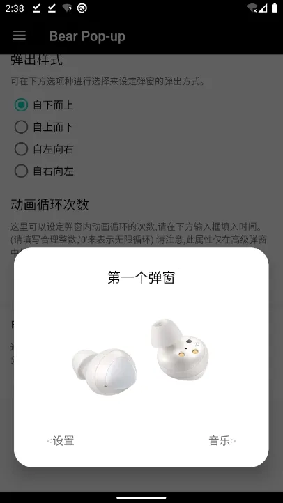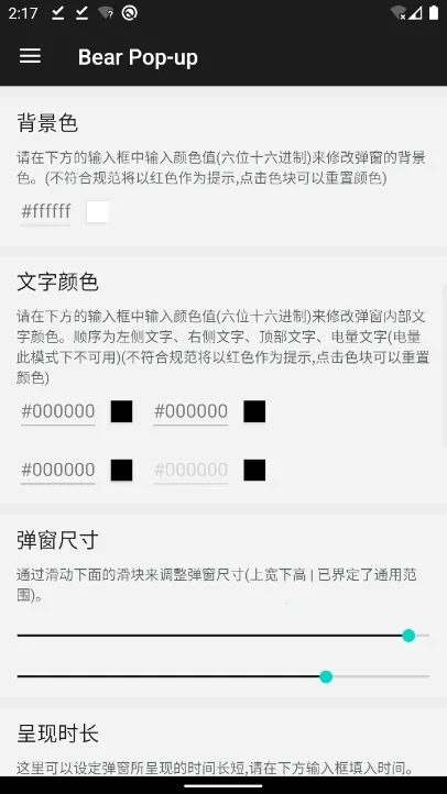 除了上方的弹窗文字内容及图片,Bear Pop-up还提供了丰富的可自定义选项,包括弹窗背景色、文字颜色(上左右文字颜色、*电量显示文字颜色)、弹窗尺寸(显示长宽)、弹窗呈现时长、左右侧按钮应用跳转、*圆角大小、*弹窗样式(方向)、*动画循环次数及*电量显示开关 。带'*'属性为登录授权用户可定制属性。