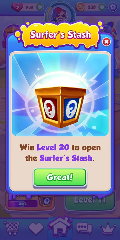 2. 探索与装饰:加入团队旅程,让休息室变新,扩展滑板天堂。爆炸消除格子,破解谜题,完成关卡解锁独特物品装饰聚会场所。