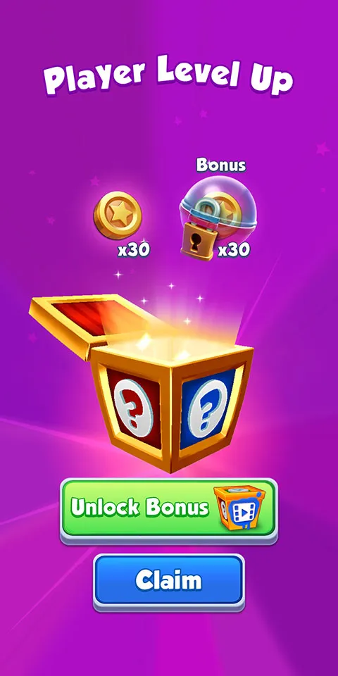 4. 多种宝箱获取方式:升级玩家等级、通过一定数量关卡、让场景元素升级进度达100,均可获得宝箱,开出金币道具等奖励。