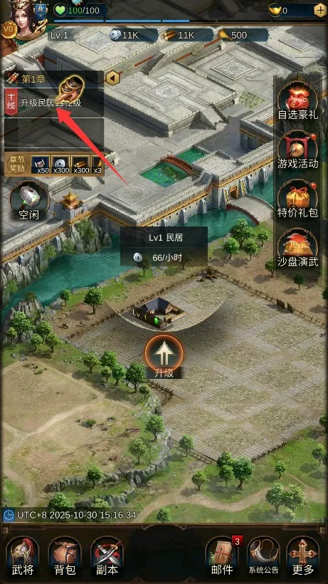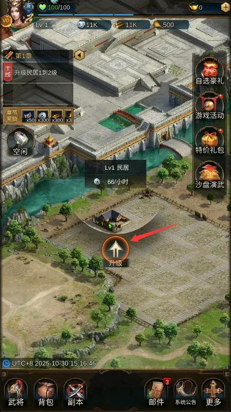 4、点击城内民居建筑区域选择升级,消耗相应资源完成建造强化城池基础。